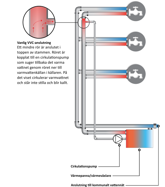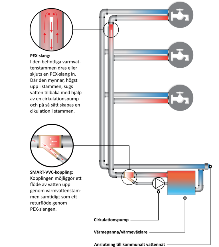 En PEX-slang förs in i det existerande varmvattensystemet genom en specialtillverkad och patenterade ventil. Slangen förs upp i varmvattenstammen tills den når översta våningsplan. Slangen kopplas sedan till en cirkulationspump som suger tillbaka vattnet genom PEX-slangen. På så vis skapar man en cirkulär vattenrörelse från värmepannan upp till översta våningsplan och tillbaka igen.